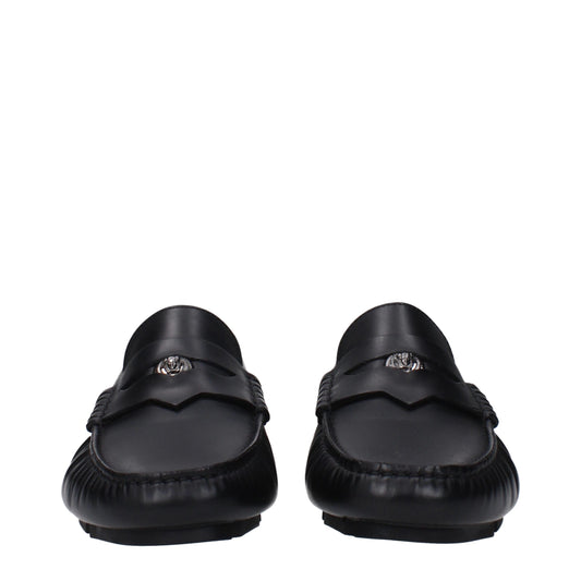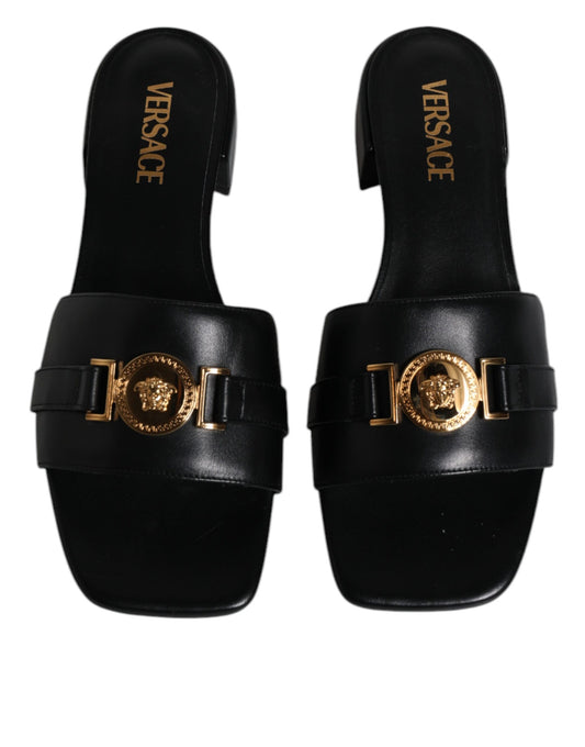 Versace Schwarz Leder Logo Plaque Slip On Slides Flats Schuhe