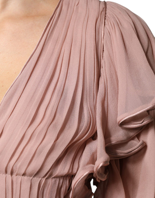 Alberta Ferretti Brown Silk Short Sleeves V-neck Pleated Top